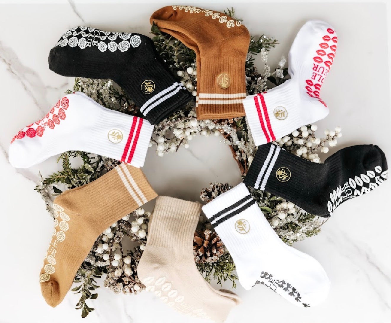 Crafted with premium cotton, couture-inspired detailing, and high-performance grip bottoms, each pair is designed to elevate your movement with comfort, confidence, and luxury in every step.